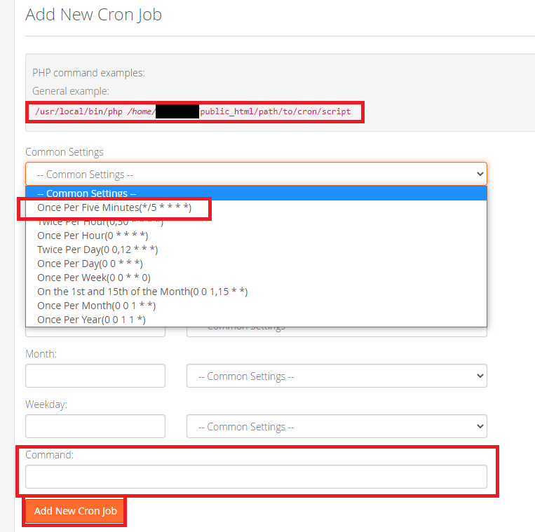 • Step 5: In case if your hosting allows you to enter entire CRON job command at ones, you can enter it in the following way (Keep in mind that if your hosting allows you to run tasks every minute, you will need to change */5 to */1):