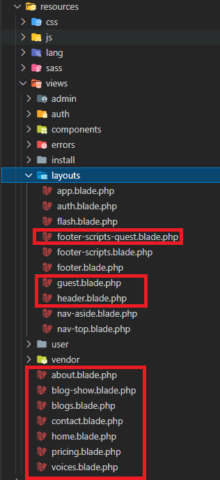 • Step 1: All files that are used as frontend pages or for frontend can be found under resources/views and couple files under resources/views/layouts directories as shown in the picture.