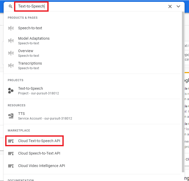 • Step 3: Afterwards search for Text to Speech keyword, and select Cloud Text to Speech API from the list.