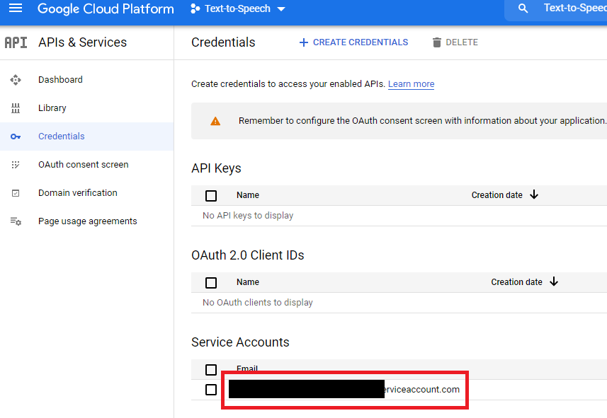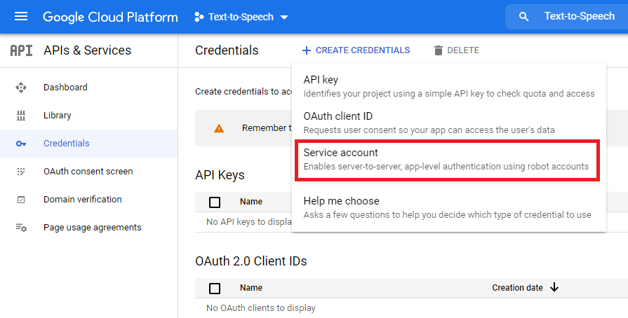 • Step 6: Click on + Create Credentials and select Service account from the list.