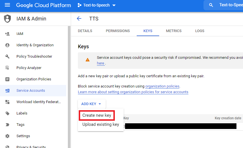 • Step 9: Under Keys tab, select Add Key -> Create new key.