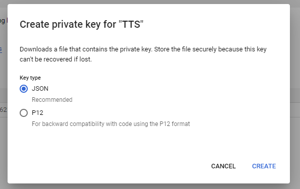 • Step 10: Select JSON as key type. Click Create, it will store in on your desktop.