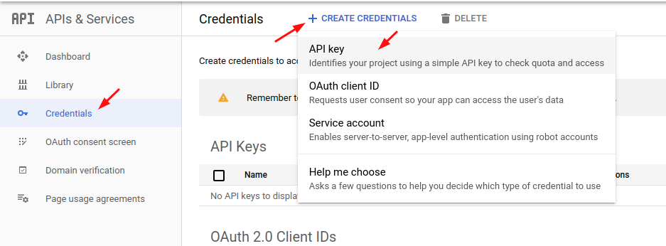 • Step 6: Click the menu button and select Credentials and click Create credentials > API key.