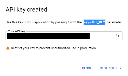 Important: Remember to restrict the API key before using it in production.